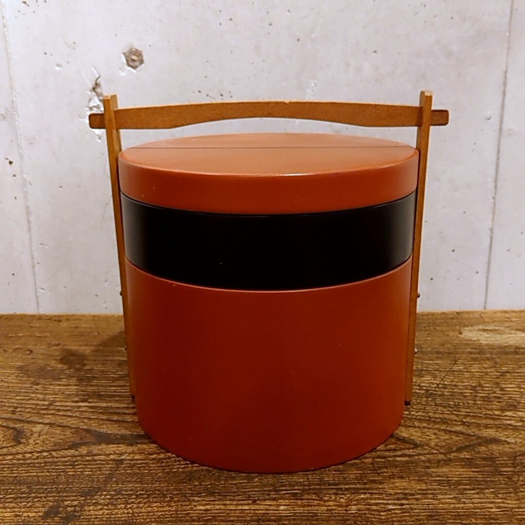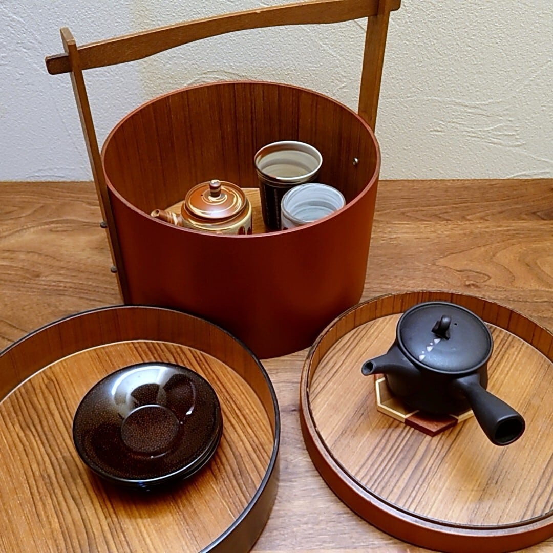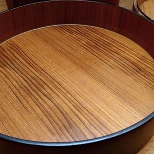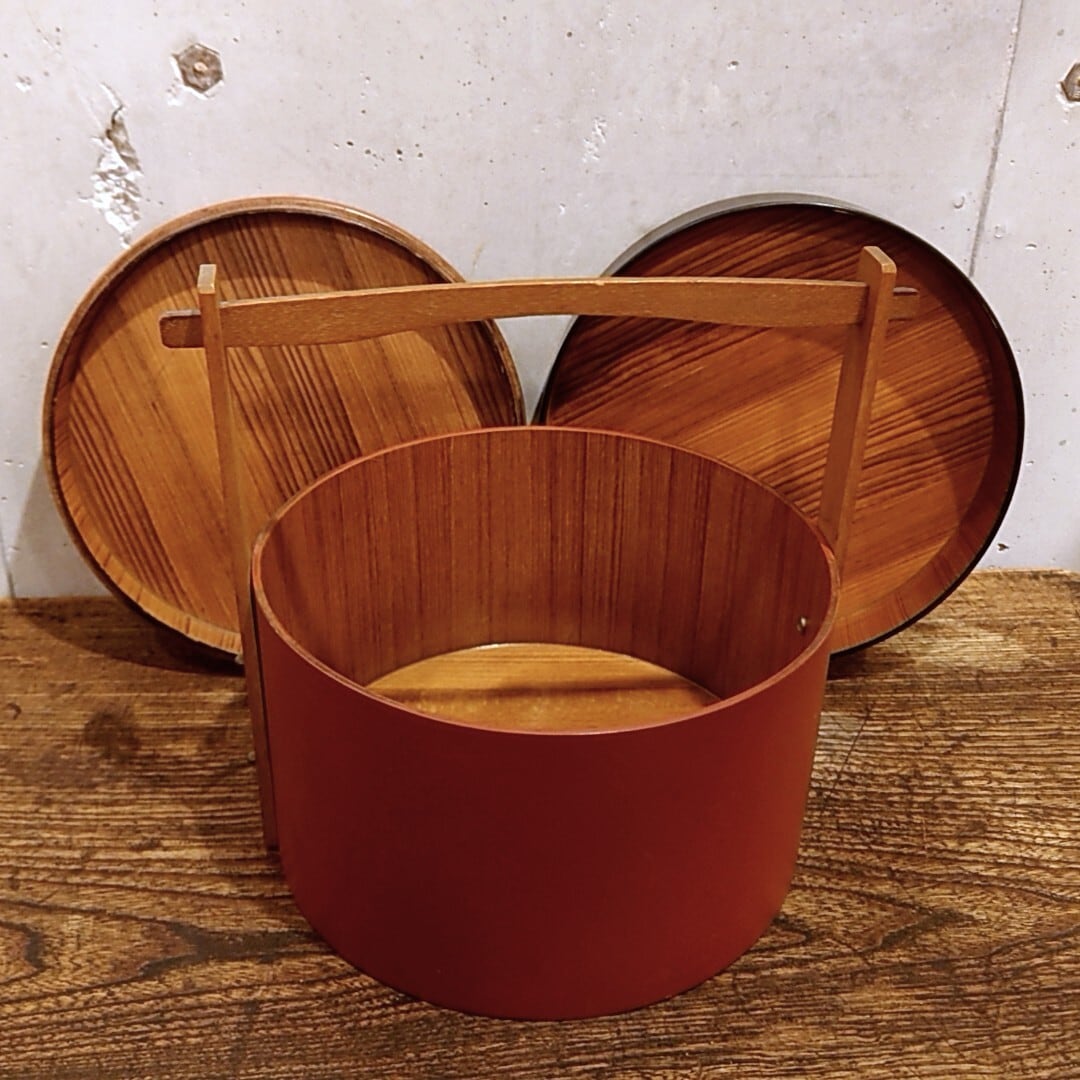 1960年代頃の日本のモダンデザイン隆盛期に製造されたと思われるチークプライウッドの手提茶櫃/手桶重です。