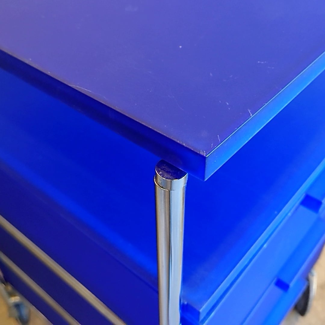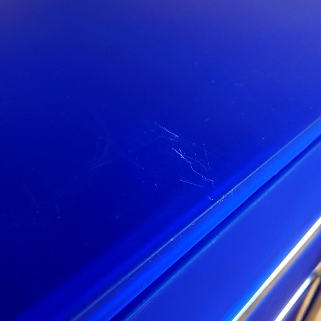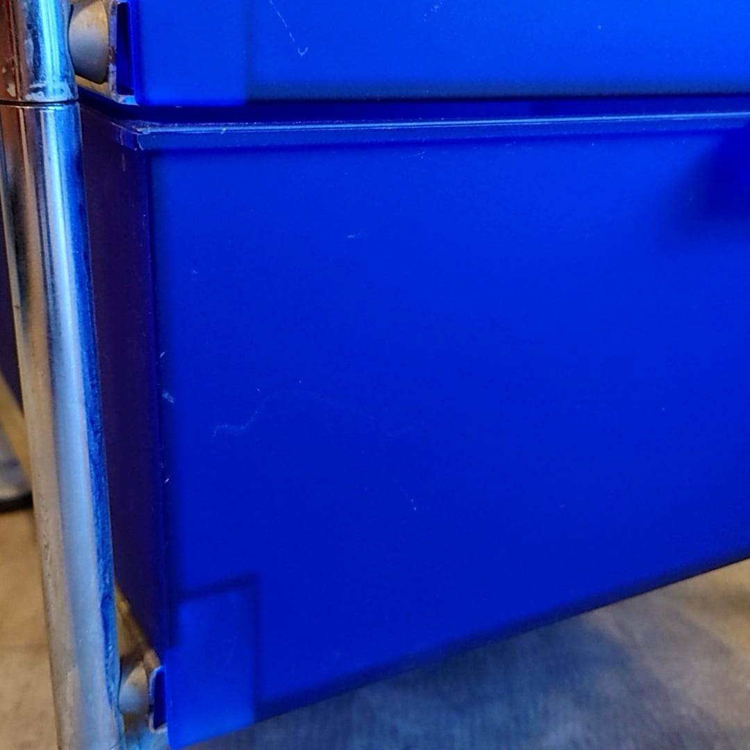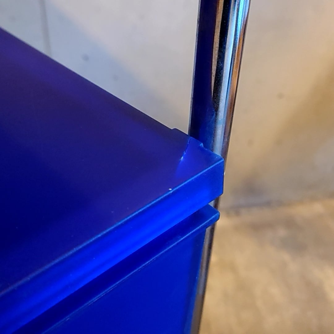 素材の性質上全体的に使用に伴う擦れキズや線キズ、ヨゴレ等見られ、また中段の棚板角に一か所割れが見られます(画像参照)。