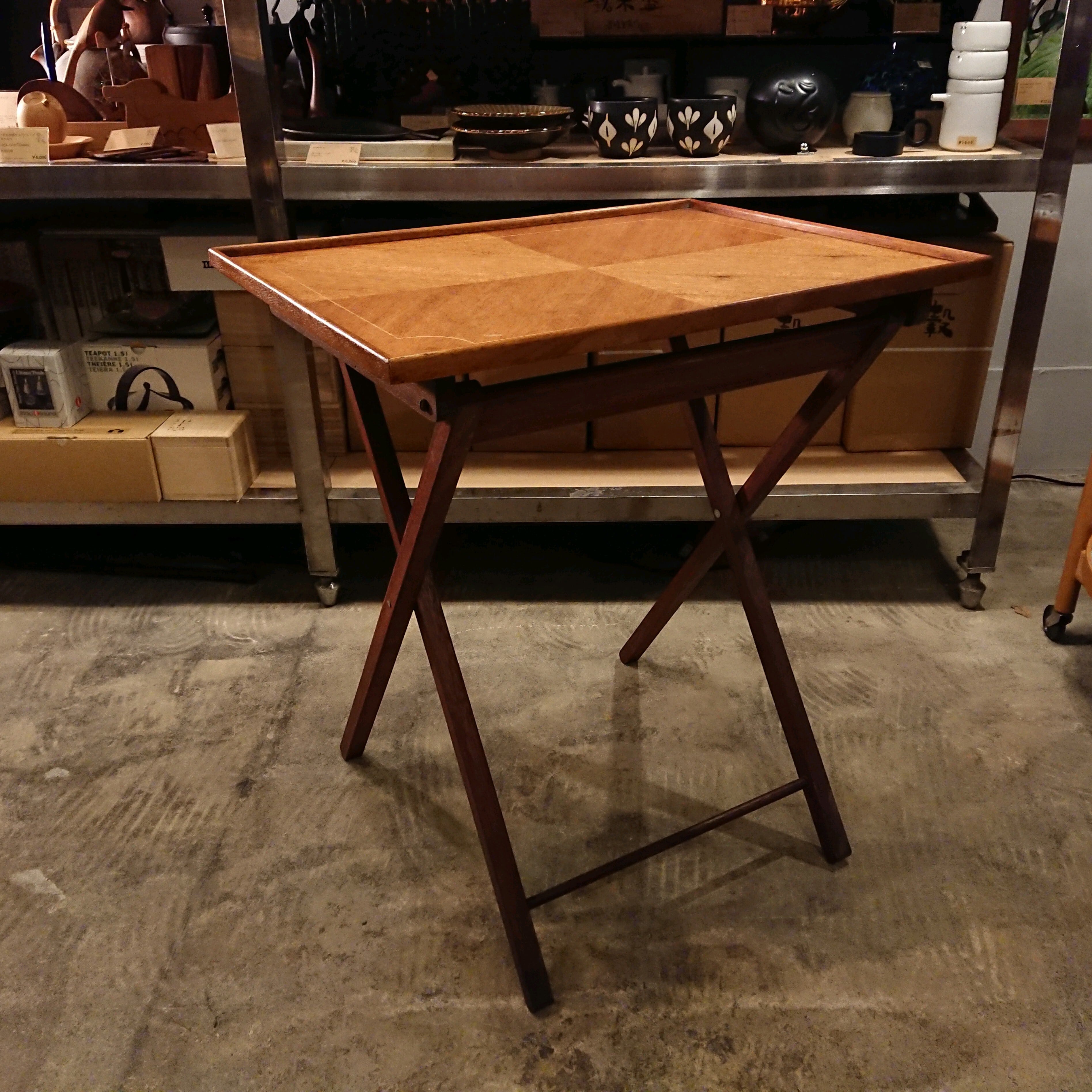 別名"ピクニックテーブル"とも呼ばれ、野外へ持ち出して使ったり、カードゲーム等の際に紅茶やサンドイッチなどを置くサイドテーブルとして使用する折りたたみ式のテーブルです。
