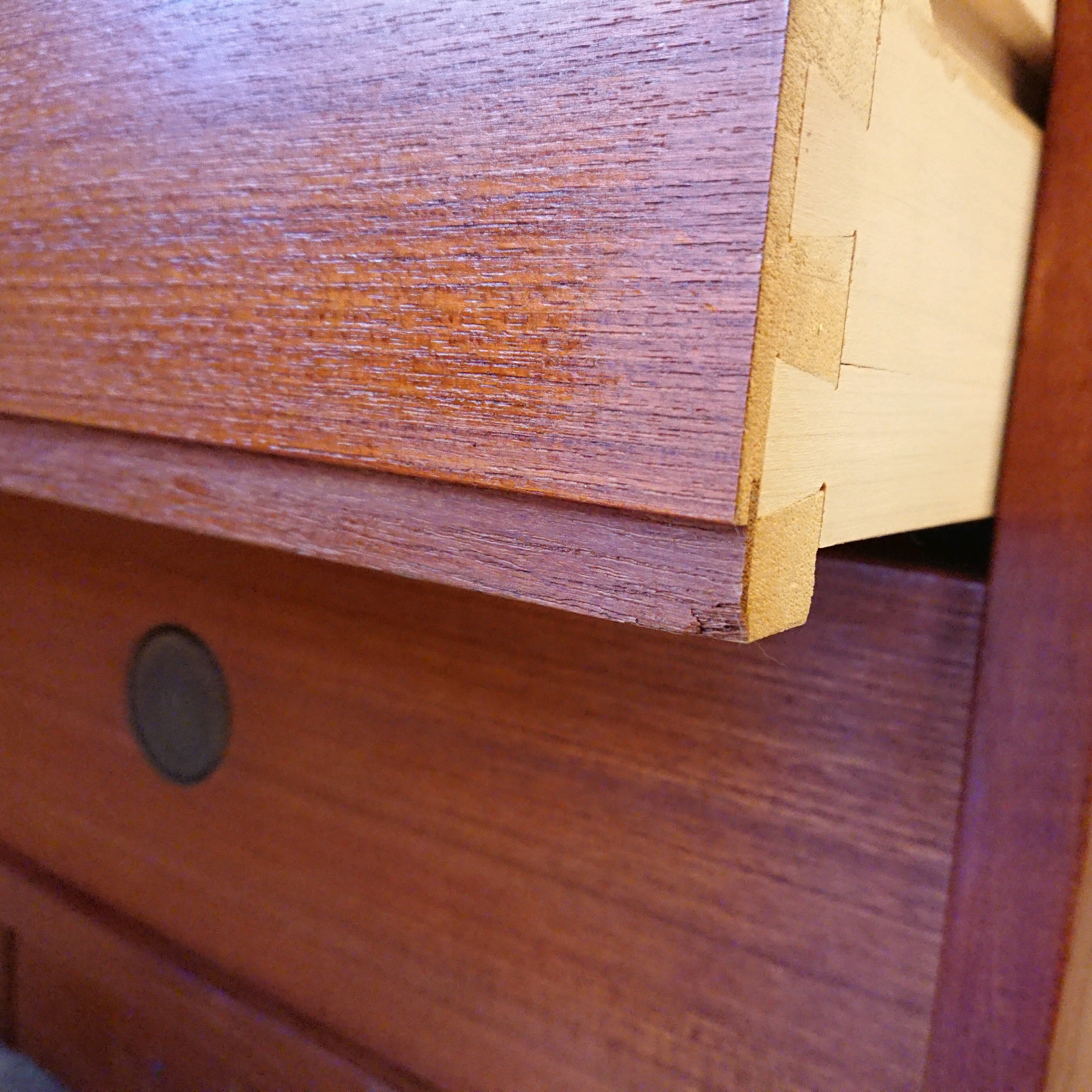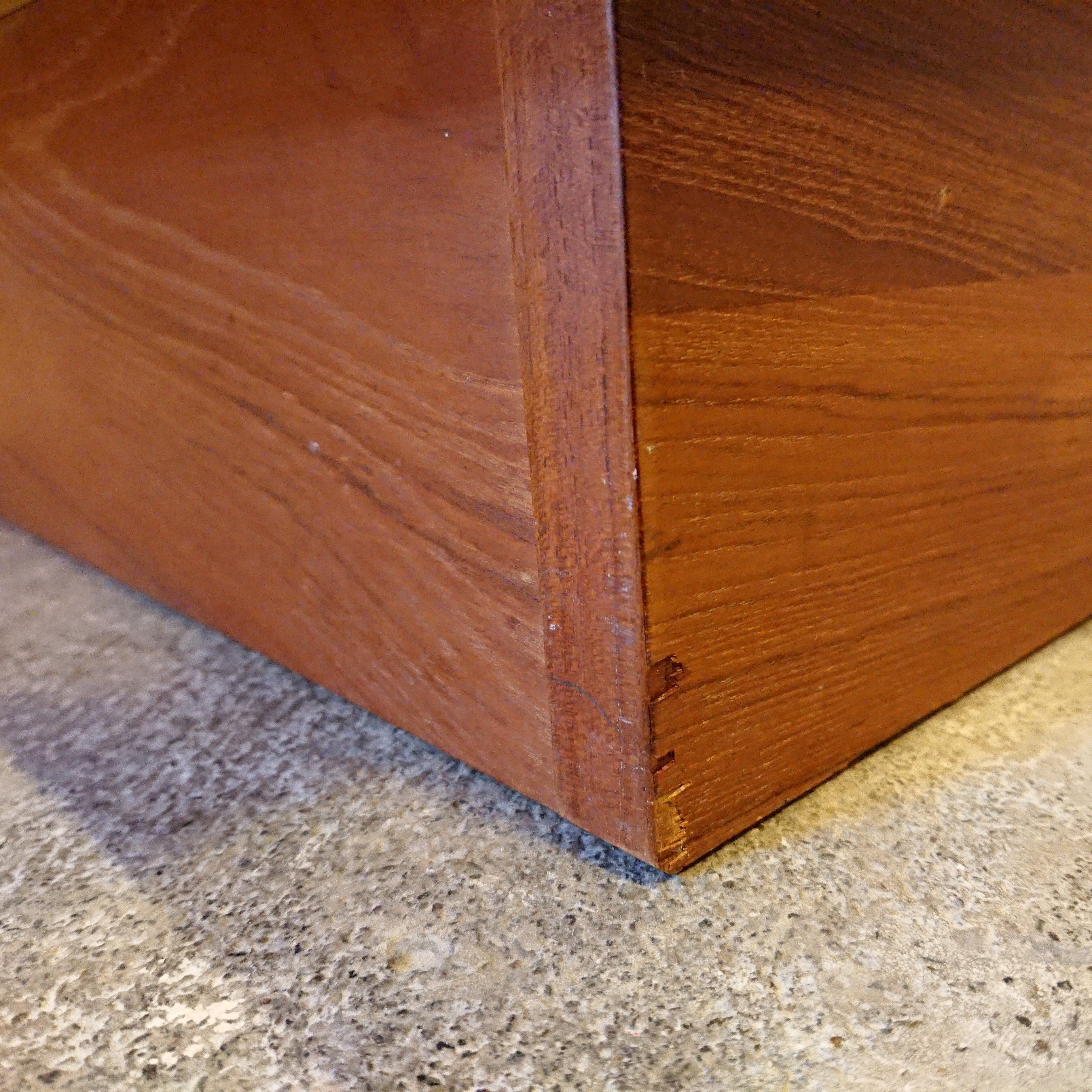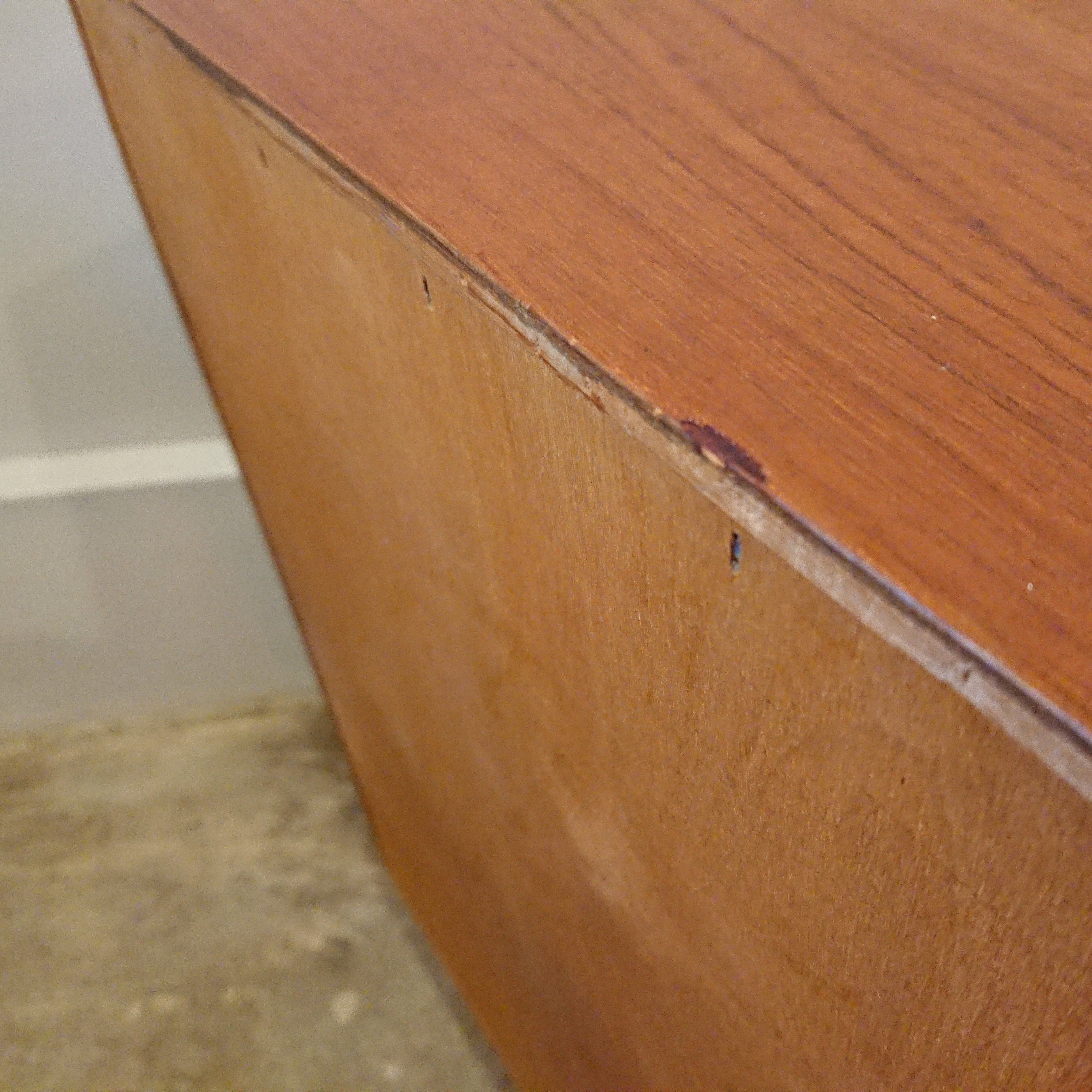 経年の品のため複数箇所の突き板の剥がれやキズ、引出し内部のヨゴレ、角に削れている箇所等全体的にダメージが見られます(画像参照)。